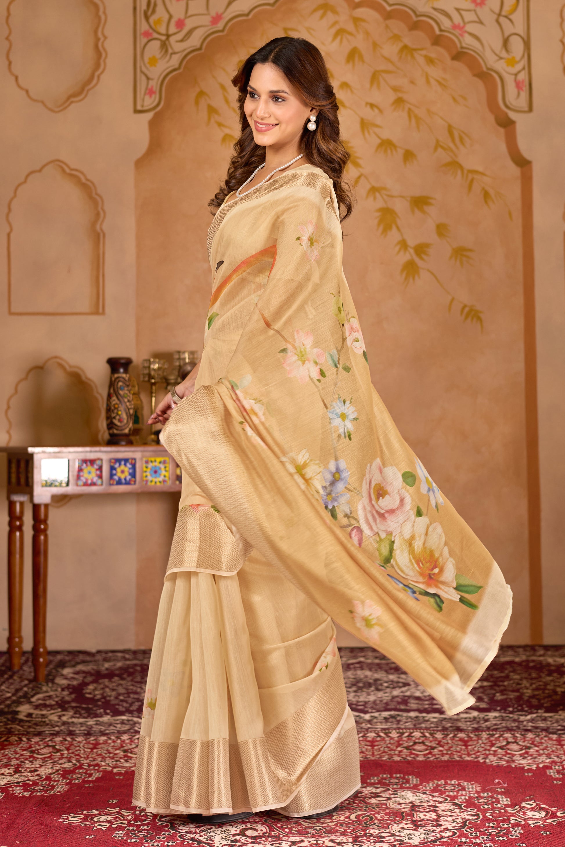 Chanderi silk digital print Off White Colour saree with gold border swan design