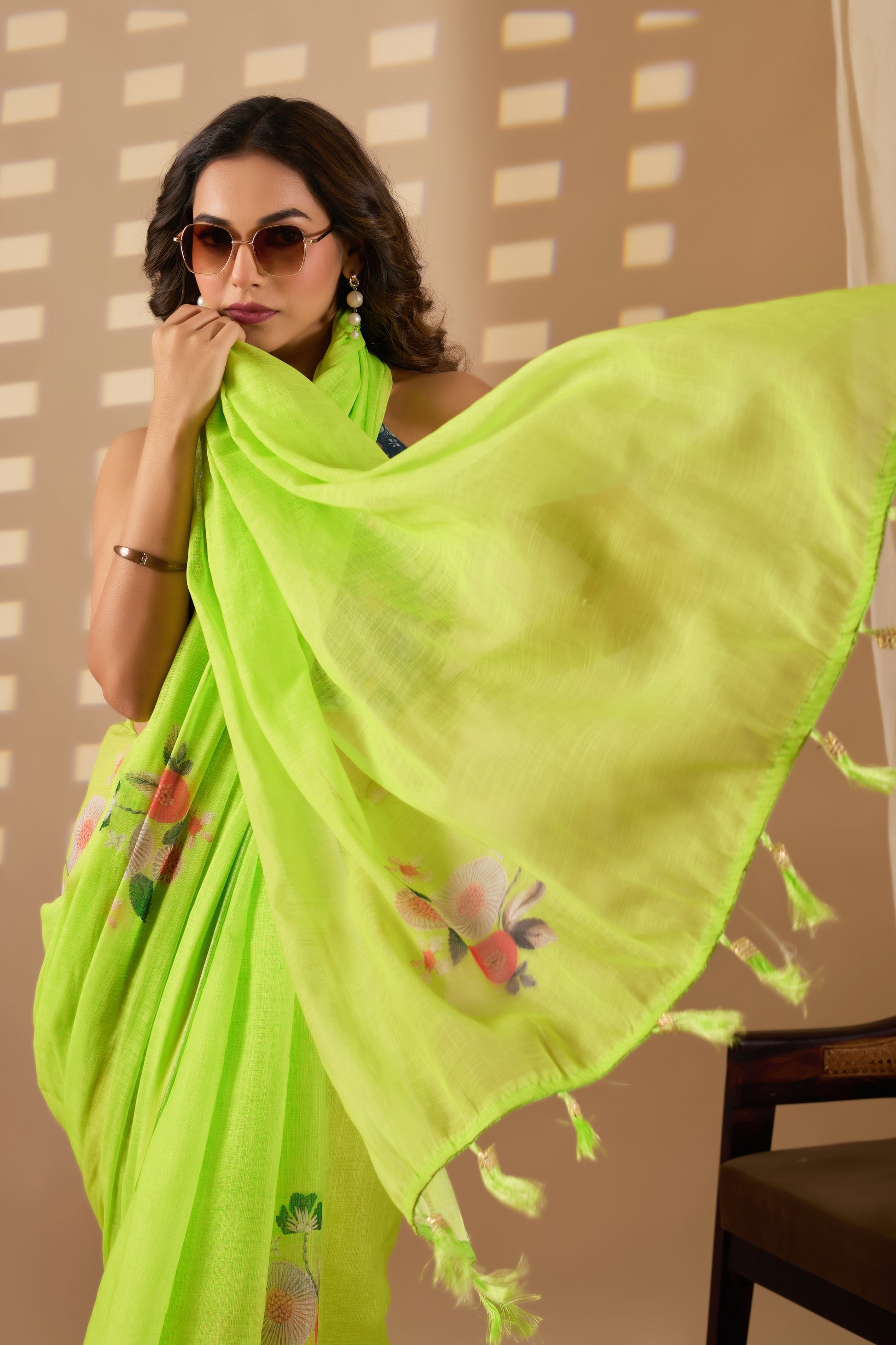 Parrot green cotton linen digital print Green Colour saree with heavy tassels