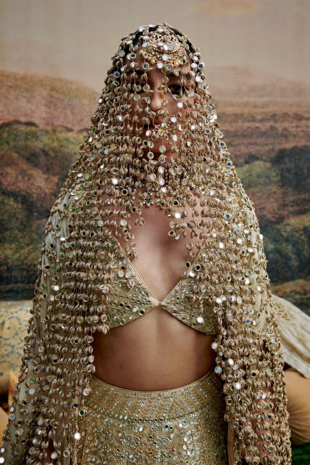 The Trending Sheesh Mirror Dupatta showcases exquisite craftsmanship with its intricate mirror tassel and jaal design, where small mirror pieces are meticulously bound together. This ivory veil adds a luminous, elegant finish to bridal ensembles and is ideal when paired with a mirror-work blouse and lehenga, elevating the traditional look with refined artistry and shine.