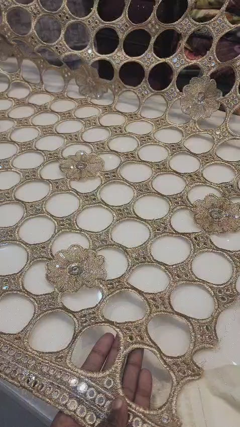 The Trending Sheesh Mirror Dupatta showcases exquisite craftsmanship with its intricate mirror tassel and jaal design, where small mirror pieces are meticulously bound together. This ivory veil adds a luminous, elegant finish to bridal ensembles and is ideal when paired with a mirror-work blouse and lehenga, elevating the traditional look with refined artistry and shine. This design has a beautiful flower embroidered motif on the veil.
