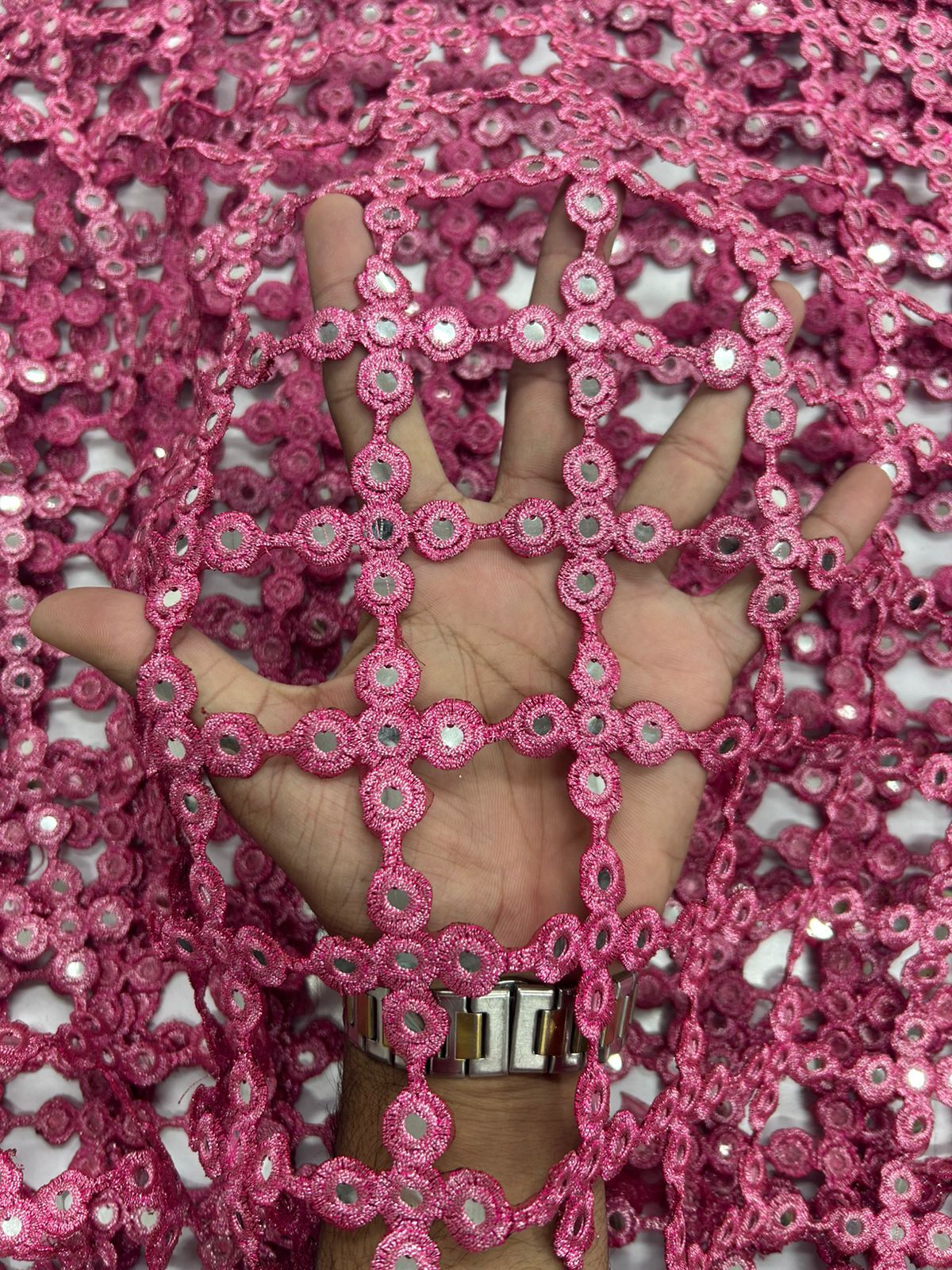 The Trending Sheesh Mirror Dupatta showcases exquisite craftsmanship with its intricate faux mirror and jaal design, where small mirror pieces are meticulously bound together. This color veil adds a luminous, elegant finish to bridal ensembles and is ideal when paired with a mirror-work blouse and lehenga, elevating the traditional look with refined artistry and shine.