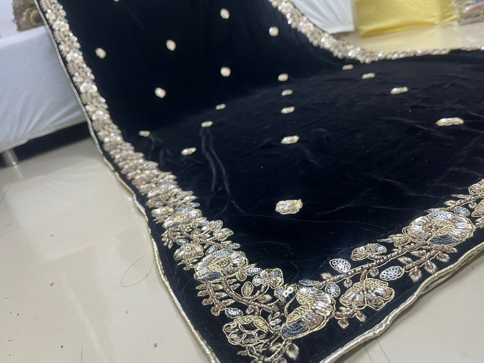 * Workmanship: Intricate gold beadwork with hand-finished border embroidery.